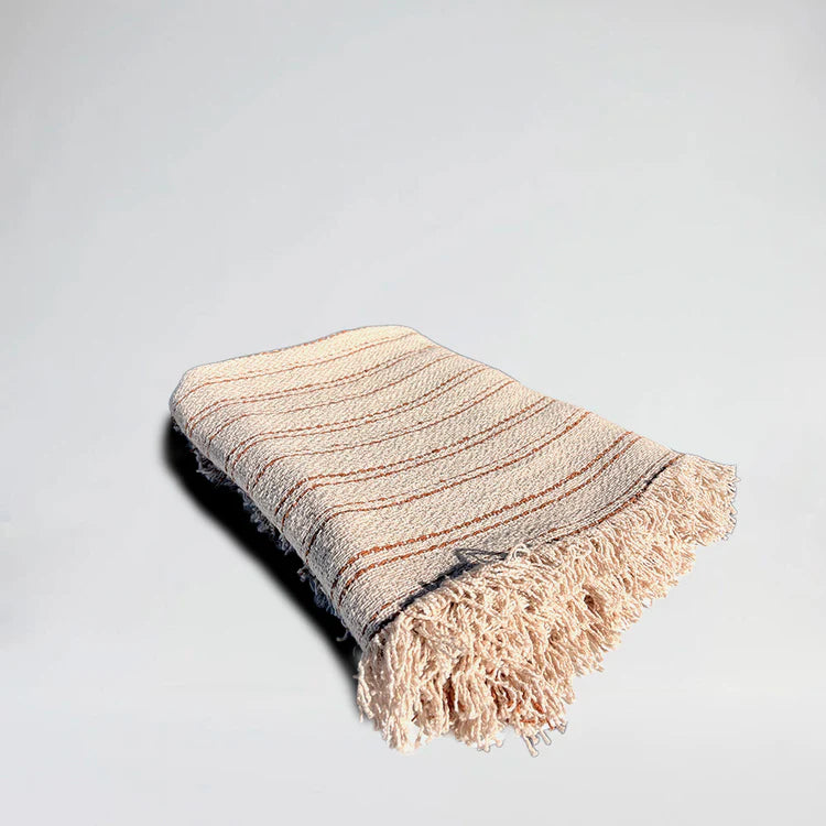Subtle nutmeg stripes are yarn-dyed into a natural base, bringing gentle contrast and a grounded, earthy feel. The generous size and fringing on all four sides make it ideal for relaxed styling across beds, sofas or reading nooks.