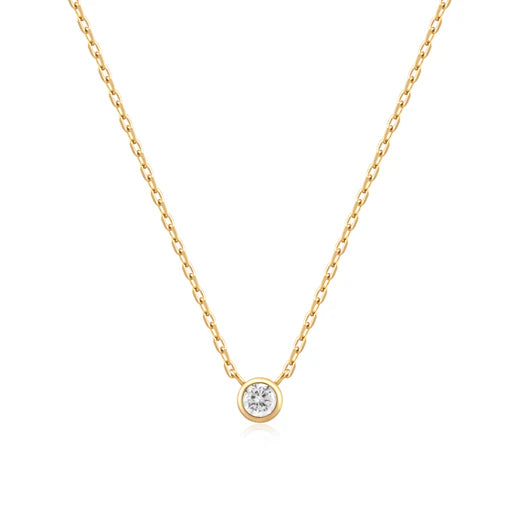 An elevated classic to add to your everyday jewellery rotation, this necklace is 14kt-plated gold sterling silver with a round cut cubic zirconia stone in a bezel setting. Stack it up with other chains or wear it alone, you will definitely refresh your daily styles.