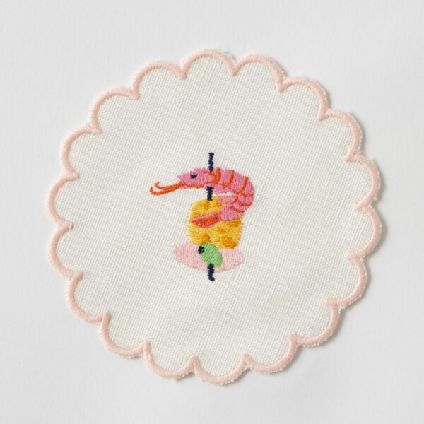 Add a pop of Mediterranean fun to aperitivo hour with the Mediterranea Embroidered Cocktail Coaster. Made from 100% cotton with a scalloped trim and an embroidered prawn and olive design, it’s a conversation piece for casual entertaining.