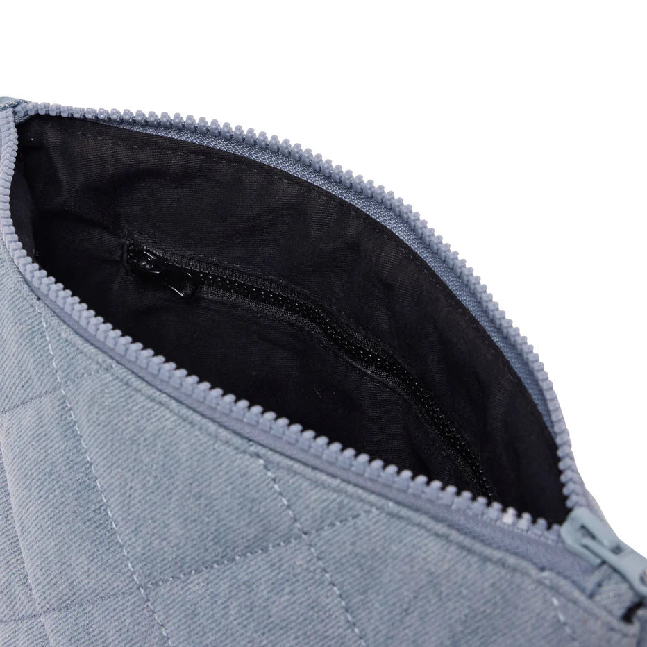 Your stylish grab-and-go pouch for makeup, tech, and everyday extras. It blends timeless style with everyday function featuring premium washed denim quilted fabric for a modern refresh, ready for anything from the bathroom shelf to a weekend getaway.